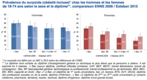 • La prévalence du surpoids (obésité incluse) reste supérieure chez les personnes les moins diplômées.
